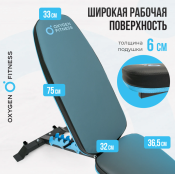Скамья для жима OXYGEN FITNESS VIRGO — это надежное и функциональное оборудование, созданное для выполнения силовых упражнений прямо у вас дома. С ее помощью вы сможете эффективно развивать верхнюю и нижнюю части тела. Компактные размеры и продуманный дизайн обеспечивают удобство использования и позволяют легко интегрировать скамью в любое пространство. Эта скамья имеет прочный квадратный профиль рамы размером 50x50 мм, что гарантирует стабильность и безопасность во время тренировок. С максимальным весом пользователя до 110 кг, она подходит для большинства атлетов. Регулируемое сиденье в трех положениях, размером 36,5 x 32 см и спинка с 6 уровнями наклона позволяют адаптировать оборудование под индивидуальные предпочтения, обеспечивая оптимальное положение для полноценной тренировки. Толщина подушек OXYGEN FITNESS VIRGO составляет 6 см, что обеспечивает комфорт во время тренировок. Возможность регулировки сиденья в 3 уровнях и спинки в 6 уровнях позволяет выбрать наиболее удобное положение для жима, а также для выполнения других упражнений, таких как сгибания или разгибания ног. Длина скамьи в рабочем состоянии составляет 166 см, ширина — 56 см, а высота — 117 см, что делает ее универсальным решением для домашнего использования. Скамья для жима OXYGEN FITNESS VIRGO — это идеальный выбор для тех, кто хочет эффективно тренироваться и достигать своих фитнес-целей в комфортной обстановке. Ключевые преимущества OXYGEN FITNESS VIRGO: • прочный квадратный профиль рамы для максимальной надежности; • регулировка положения сиденья (3 уровня) и спинки (6 уровней) для индивидуальной настройки; • комфортабельные подушки толщиной 6 см для удобства во время тренировок; • максимальный вес пользователя до 110 кг, что подходит для большинства пользователей.